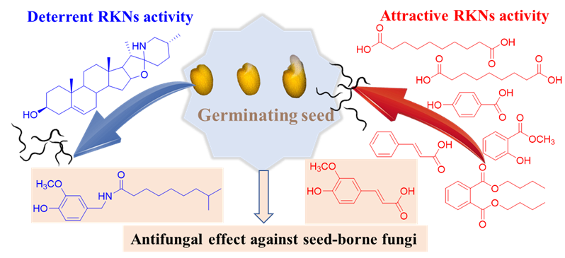 本研究通过自制的两向选择式嗅觉仪,证明番茄种子在萌发时能够引诱线虫,且是通过萌发时释放的化合物来实现的。线虫可通过感知种子萌发时的分泌物进一步侵染胚根,使其更早寻找寄主。通过活性追踪、结合天然产物提取分离和结构鉴定,从种子渗出物中得到了18个化合物。生物活性研究结果表明,酯类、脂肪酸和酚酸类化合物对线虫具有较强的引诱活性,是线虫感知寄主植物的重要化学信号物质。生物碱类化合物对线虫有较强的趋避活性,是植物抵御线虫侵染的重要防御物质。此外,一些酚酸和生物碱类化合物还会影响种传真菌的定殖。