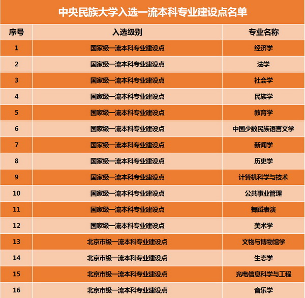 新闻网讯 近日,根据《教育部办公厅关于公布2019年度国家级和省一级一流本科专业建设点名单的通知》(教高厅函〔2019〕46号),我校民族学、社会学、中国少数民族语言文学、历史学、经济学、法学、教育学、新闻学、计算机科学与技术、公共事业管理、舞蹈表演、美术学12个专业获批首批国家级一流本科专业建设点,文物与博物馆学、生态学、光电信息科学与工程、音乐学4个专业获批首批北京市级一流本科专业建设点。