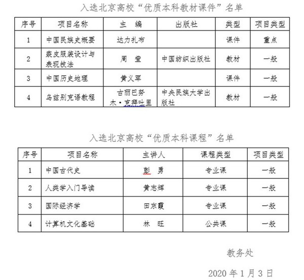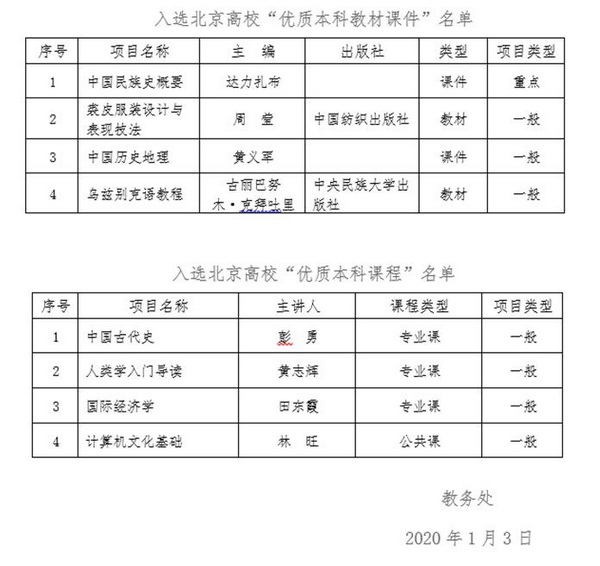 新闻网讯 近日,根据《北京市教育委员会关于公布“优质本科课程”和“优质本科教材课件”遴选结果的通知》(京教函〔2019〕692号)公布的遴选结果,我校8个项目入选北京高校“优质本科课程”和“优质本科教材课件”建设项目。